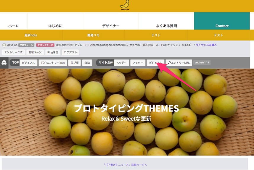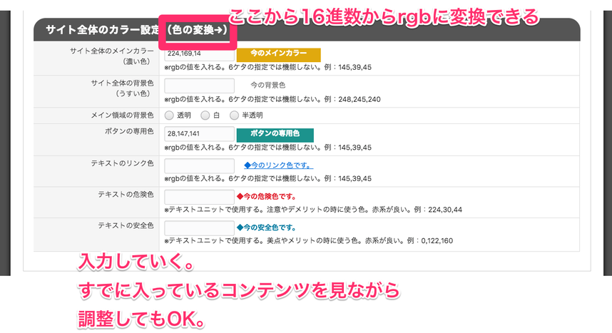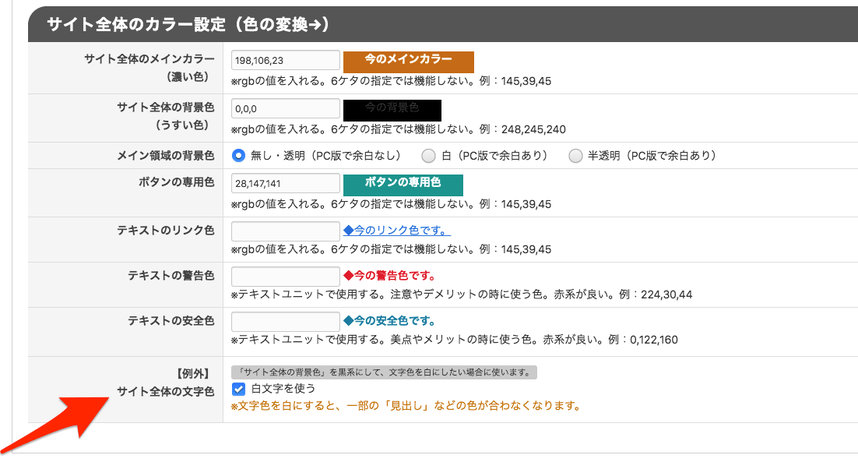 サイト全体の色を設定 1.サイト全体のビジュアル設定へ 2.値を入力する ダークモード(黒背景+白テキスト)について ↑ここからダークモードに変更できます。 ただし、基本は白背景で制作するのをおすすめします。 プロトタイピングで、ダークモードに関する質問や依頼が増えてしまって、ビジュアルに関わる時間が増えるためです。 サクッと黒ければ良い、という案件なら使うと良い機能です。
