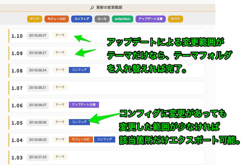 v1.08からv1.10など、差分が少ない場合はテーマを入れ替えるだけで完了します。