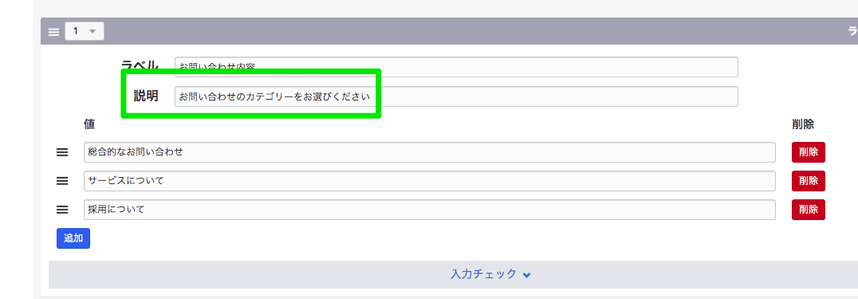 動的フォームの設定から「説明」を入力すると、表示側でinputの上部に表示できる。